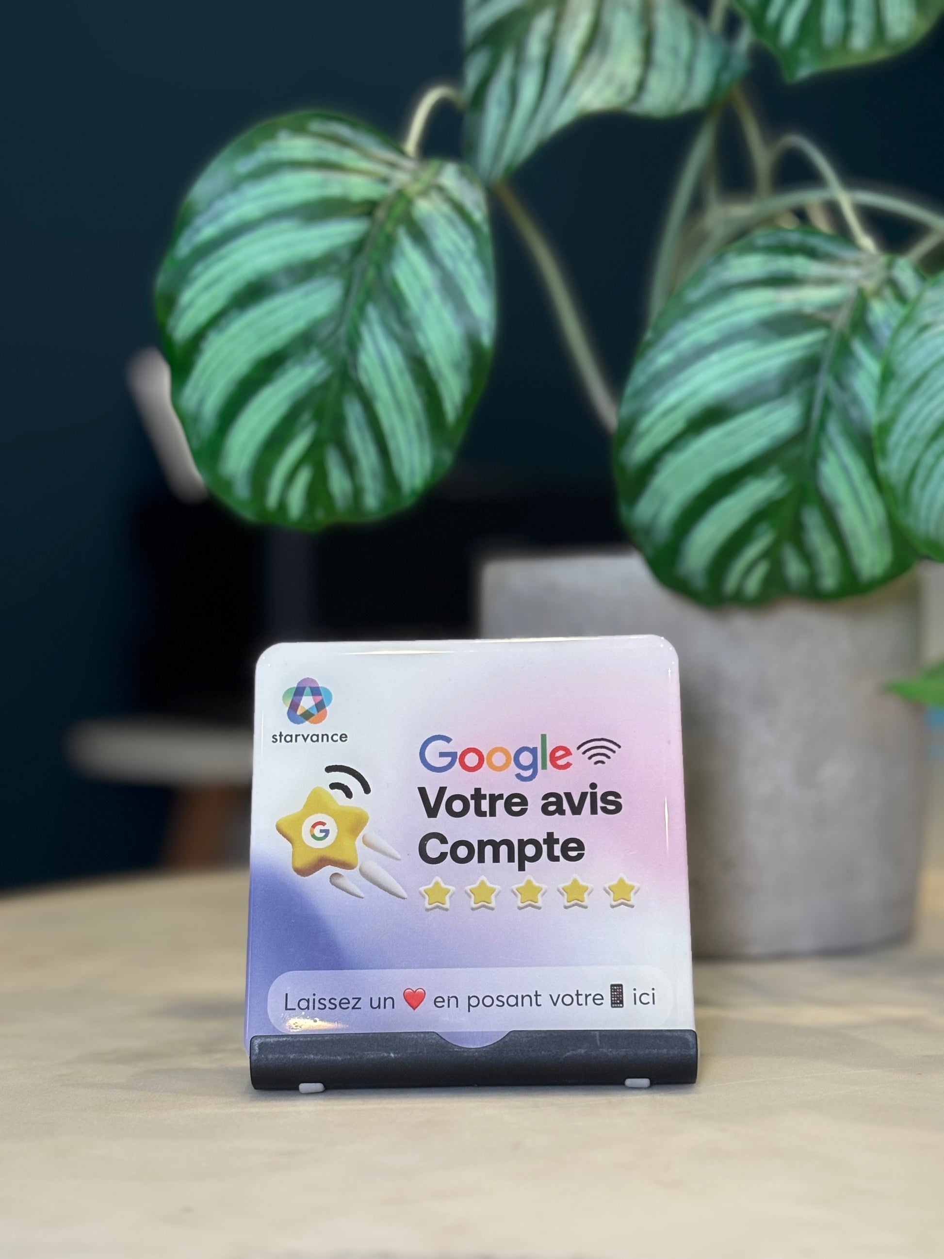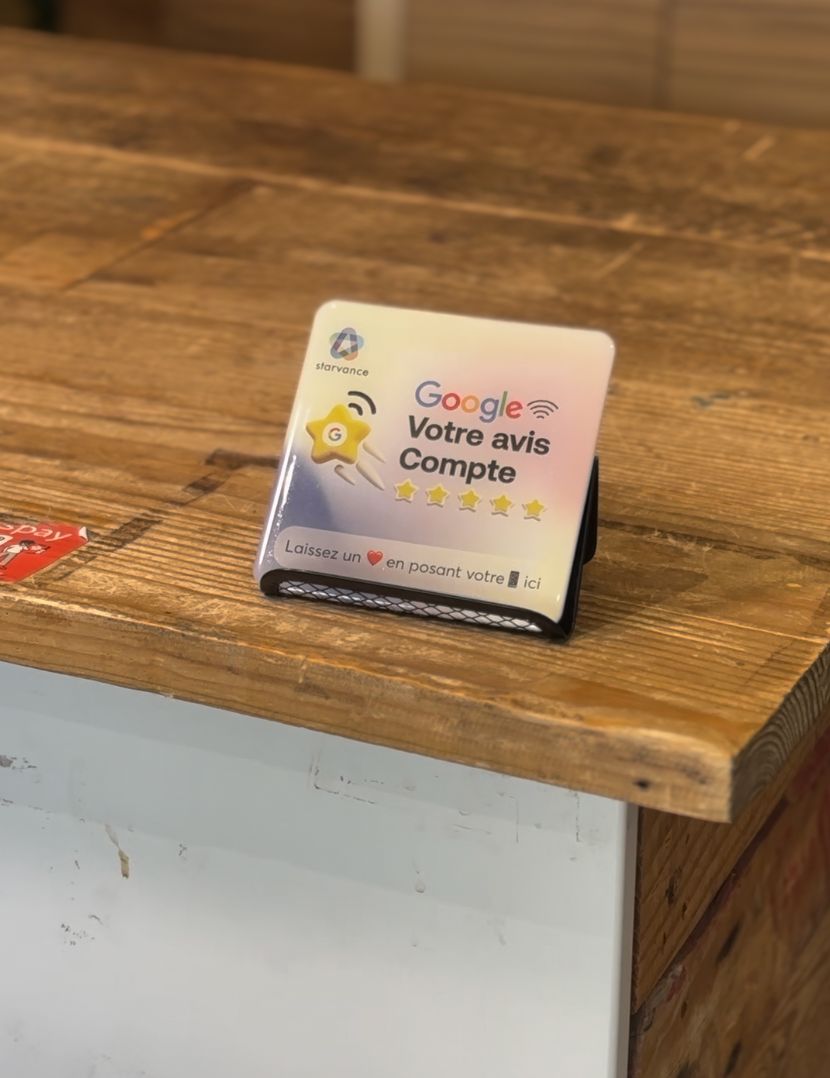 Le client approche son téléphone du Linker, ouvre la notification qui s'affiche et accède directement à la rubrique avis de votre fiche Google